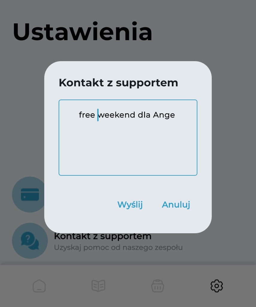 Zaloguj się do aplikacji Wejdź w ustawienia (prawy górny róg) Wybierz „Napisz do nas” i wpisz wiadomość: free weekend dla [Twoje imię] Gotowe! Aktywuję dla Ciebie pełną wersję na 30 dni 💛